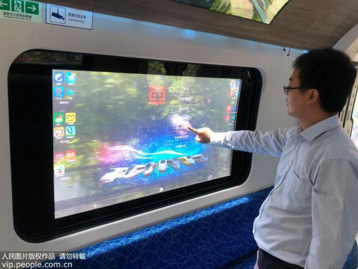 В окна встроены прозрачные интерактивные сенсорные экраны, прикоснувшись к которым пассажиры могут читать новости, смотреть фильмы и телепередачи.