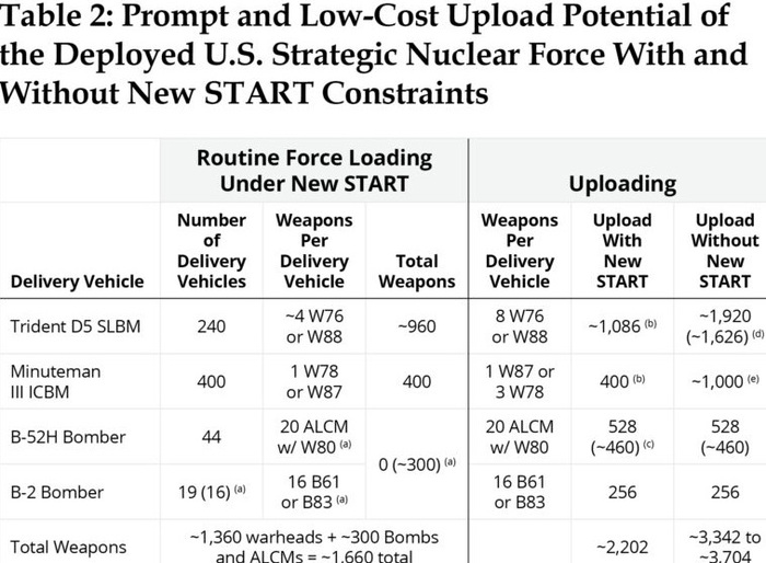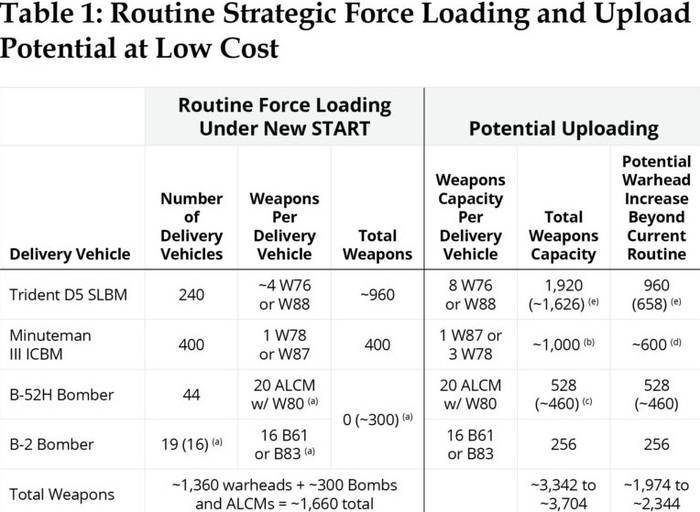 Если не будет ограничений по договору СНВ-3, то БРПЛ "Трайдент" можно увеличить с ~960 до ~1626 боеголовок, а МБР "Минитмен" с ~400 до ~1000, что в сумме даст ~2626 развёрнутых на ракетах боеголовок.