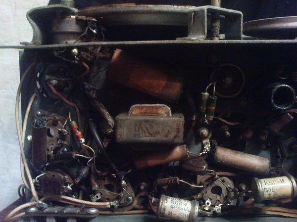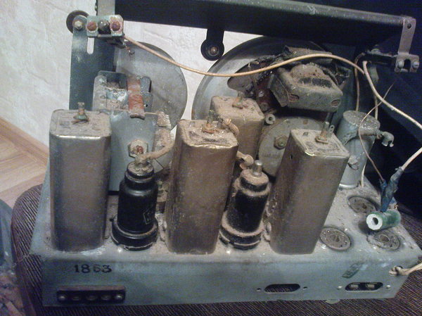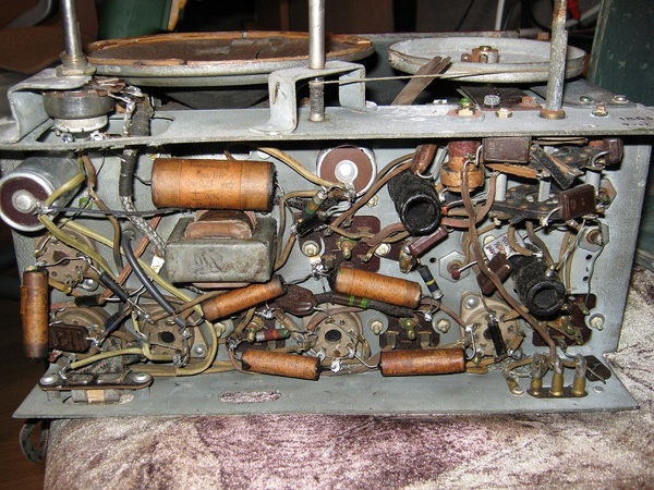 В целом, состояние шасси порадовало. Все его недостатки - это два более новых конденсатора КБГ-И, неродной электролитический конденсатор и неродные лампочки подсветки. Всё остальное полностью родное, сохранились все лампы, в том числе и редкие 30-вольтовые (на фото сняты).
