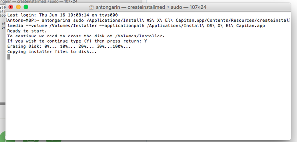 sudo /Applications/Install\ OS\ X\ El\ Capitan.app/Contents/Resources/createinstallmedia --volume /Volumes/Installer --applicationpath /Applications/Install\ OS\ X\ El\ Capitan.app