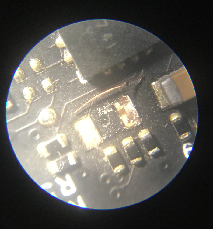 Прокладываю новые дорожки из тонкого проводника, а в местах пайки оторванного керамического конденсатора делаю проводник "гармошкой".