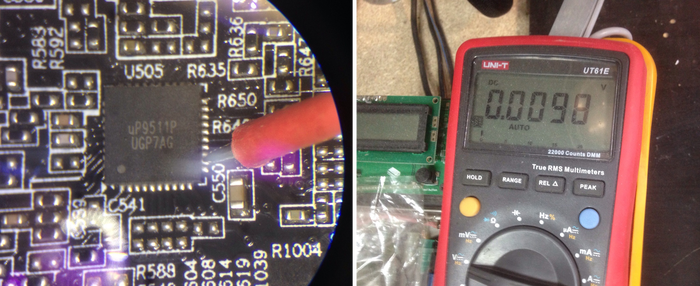 Виновником оказался сам шим-контроллер uP9511P. Меняю его на новый. Сопротивление по питанию 5В выросло. Однако, оно все равно далеко от нормы. 111,5 Ом очень мало.