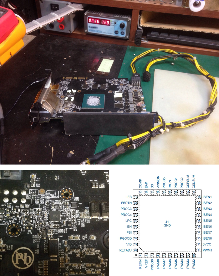 Пробую подключать карту к лабораторному блоку питания. Без этих трёх фаз питания ГПУ карта вполне должна запуститься
