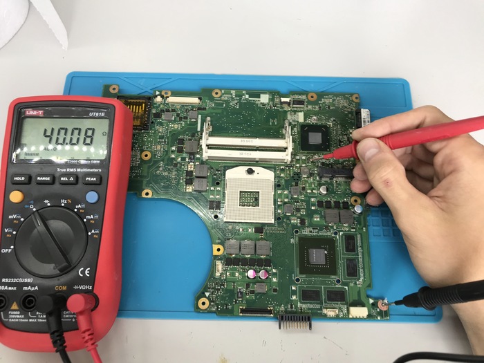 После всех процедур подаем питание и пробуем стартануть, изменения только в потреблении, оно стало 1.662 ампера, но картинки все так же нет, но экран при включении как бы заливается черным цветом, что наводит на определенные мысли, вероятнее всего ноутбук уже начал стартовать и у нас нет подсветки, осмотрим шлейф, отдираем защитный скотч и смотрим.