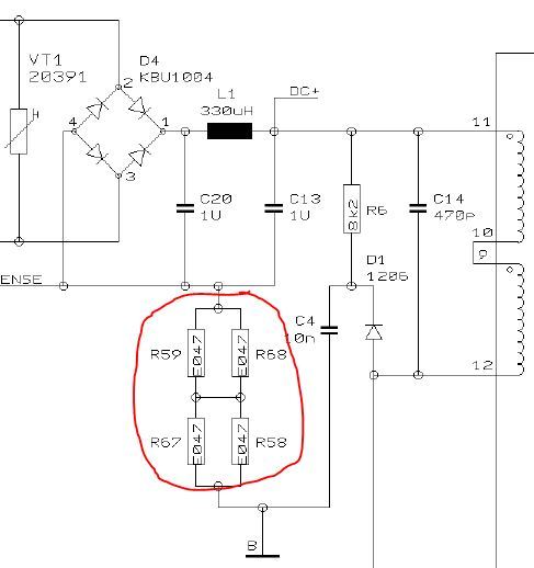 Ооооок. Далее смотрю на место взрыва на плате – это бахнули 1 ваттные резисторы R58, R59, R67, R68. Вот началось самое интересное – я хер пойми что это за обозначение такое в схеме «E047».
