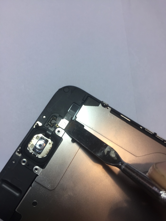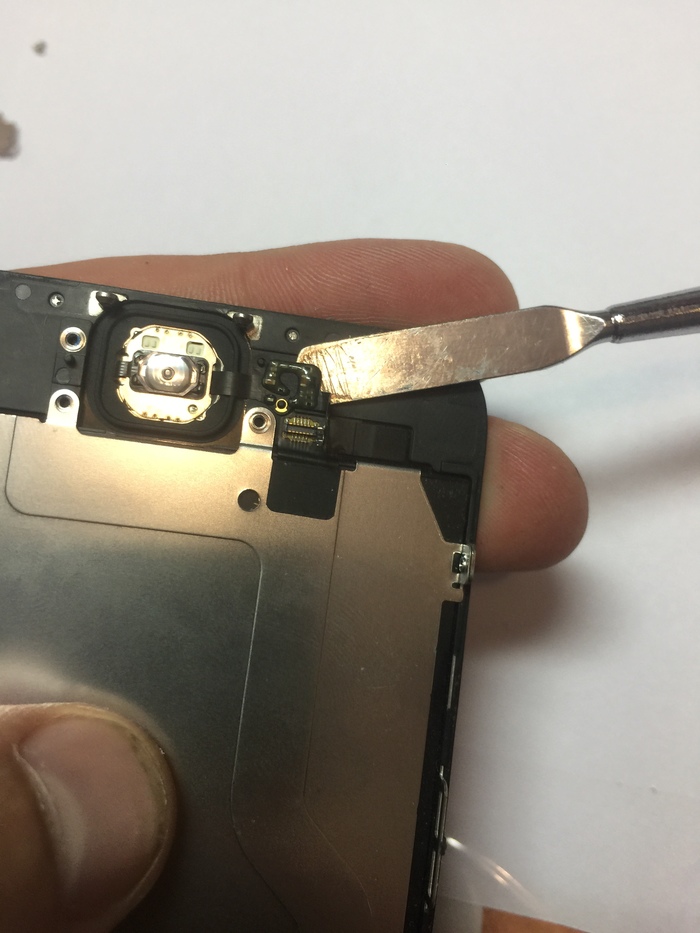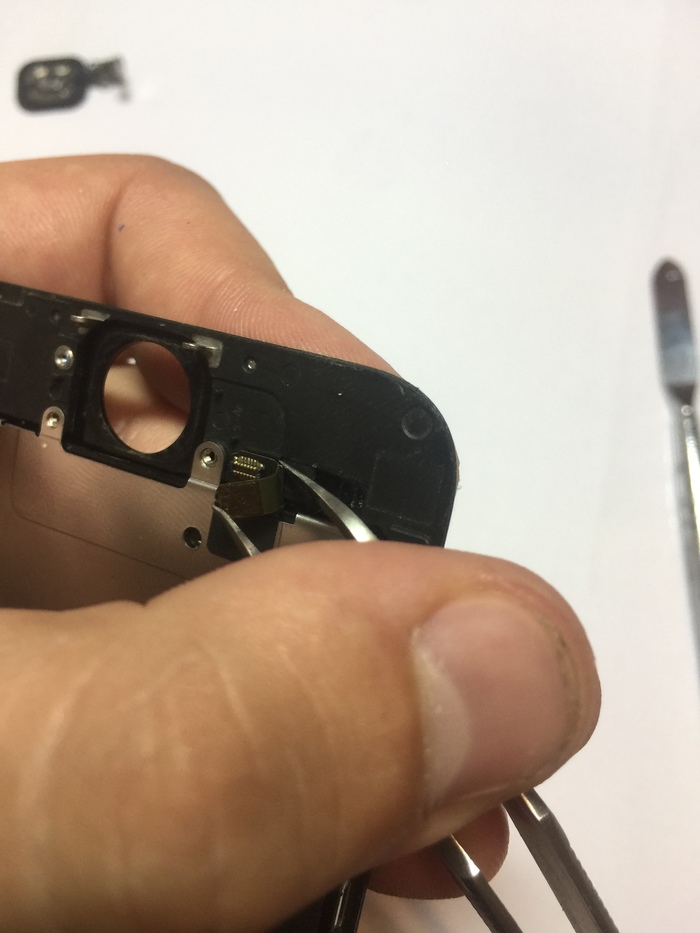 7. Аккуратно отсоединяем шлейф кнопки, очень аккуратно, я одной лопаткой держу Разъем, второй отсоединяю шлейф.