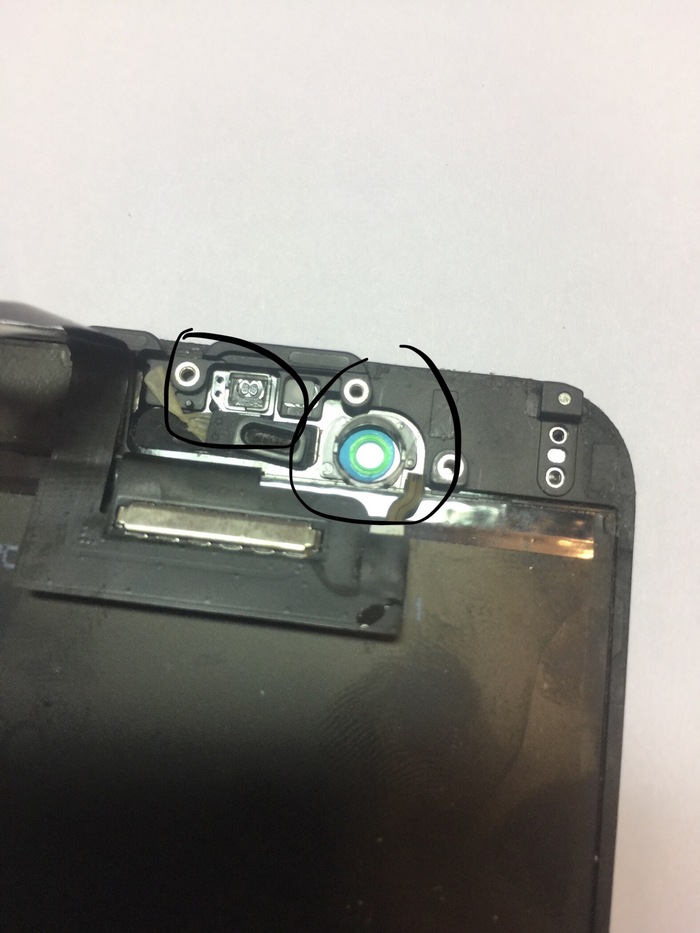 16. Переходим к шлейфу с фронтальной камерой. Одеваем прям на светочувствительный элемент пластиковую деталь (крепление) и так же ставим на место крепление к фронтальной камере.