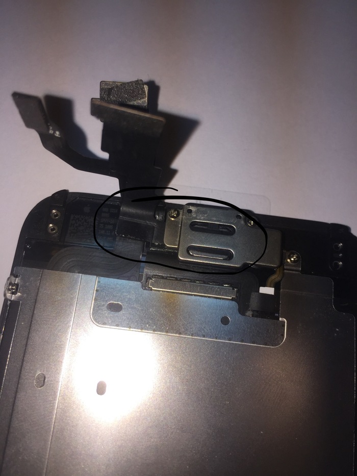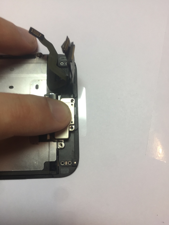 11. Далее нужно снять шлейф с фронтальной камерой, снимаем пластину, динамик, фронтальную камеру вынимаем, и нужно поддеть аккуратно место где находится светочувствительной элемент. Последним шагом нужно снять микрофон, он приклеен к сетке Динамика, аккуратно поддеваем и отделяем его от корпуса.