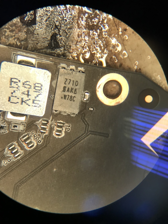 Посмотрим поближе. Залит DRMOS CPU. Это не страшно. Сняли окисленную мелочевку и заменили. Остатки кваса убрал ватной палочкой смоченной в теплой воде(да, готовьте полыхающие пуканы заранее. Я мою платы водой, а ещё жидким мылом и фейри и никто меня от этого не отговорит.)