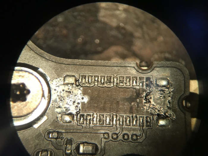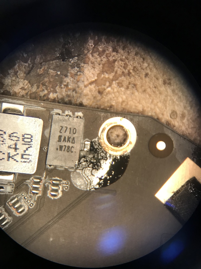 Начнем с коннектора Touch ID. Обратите внимание на верхний правый контакт. ему совсем плохо. Тут же видно что оба резистора снизу окислились совсем. Кстати, расскажу метод, как я проверяю стоит ли менять тот или иной резистор или конденсатор после воды. Сначала само собой замеряется сопротивление\ёмкость и сверяется со схемой. Если всё норм - это еще не гарантия того, что он будет работать. ведь контакт мог остаться только сверху, а снизу уже ничего нет. В общем проверяю я эти элементы толчком пинцета в обгорелую сторону. Если резюк или кондер сорвало - меняю на другой. В данном случае резисторы оборвались при тесте, ну а кондер снял феном за компанию.
