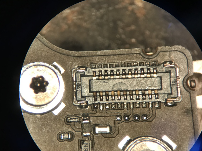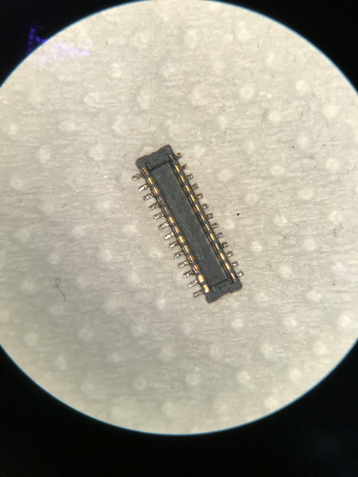Снятый разъём Touch ID. Снимал грея с другой стороны платы, т.к. таких разъёмов у меня на донорах нет и придется восстанавливать то, что есть. Коннектор был очищен от говен, отмыт, надфилем почищены посадочные контакты.
