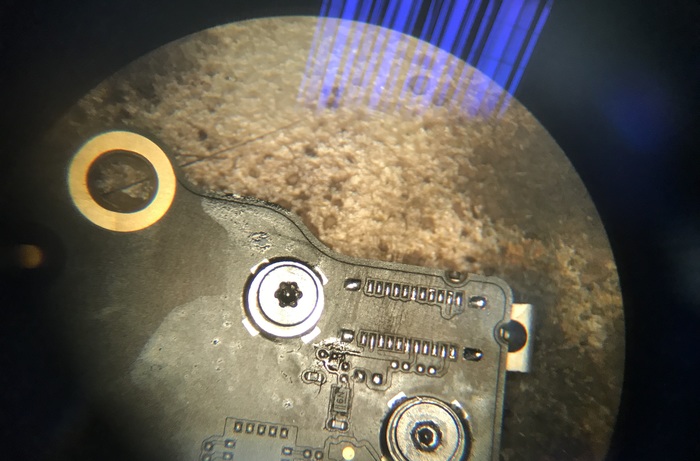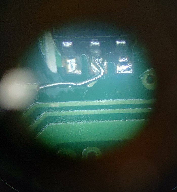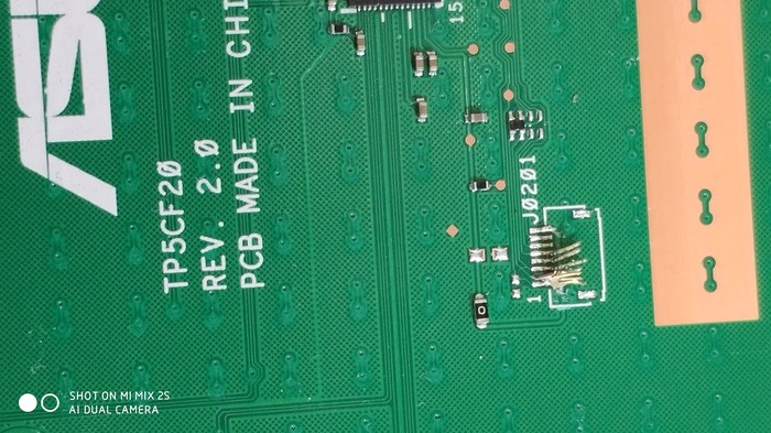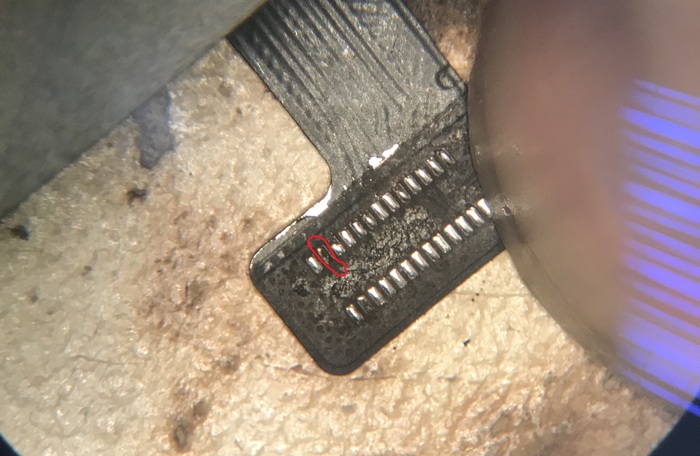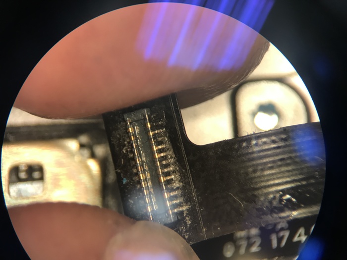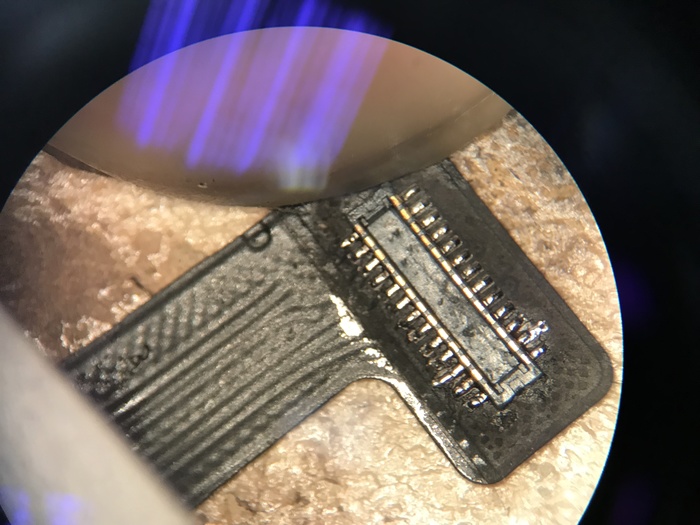 Сняли. На шлейфе ситуация тоже не очень с одной ножкой. Её так же пришлось аккуратно выскабливать лезвием до медного слоя.