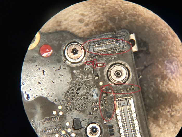 А вот правой части платы досталось прилично. Сгнил так хорошо коннектор Touch ID и по совместительству кнопки включения, а так же рассадник конденсаторов у коннектора к шлейфу с Type C разъёмами. Ну и 2 резистора и конденсатор обведенные в маленькие овалы тоже подустали. Будем менять.