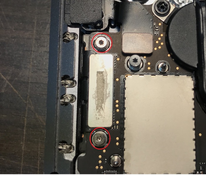 Обратите внимание на правый винт, что между разъёмов. Это мастера из СЕРСО его так заебали. Я честно говоря не очень понимаю почему официальный представитель Apple не может позволить купить себе набор хороших немецких отверток, чтобы не срывать так винты. Забегая вперед - отвечу на вопрос нафига на снятой плате вкручены винты. Эти винты изначально удерживают щитки, которые в свою очередь держат шлейфа, чтобы те не выпали. При разборе щитки я снимаю, а винты(на маках от 16 года) вкручиваю обратно, т.к. ещё не запомнил их расположение наизусть.