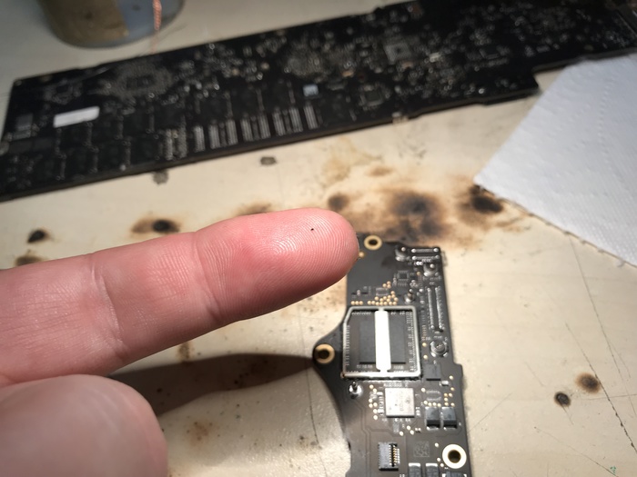 Конденсаторы снизу и коннектор Type-C были починены по такому же методу. Разве что конденсаторы 0.01uf(вроде столько, не помню уже) вольтажём 25V я собирал с 10 донорских плат. Фишка в том, что на старых платах 25V водится только на разъёме Thunderbolt и на каждой плате стоит 2-4 конденсатора нужного номинала.