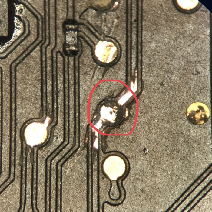 Я померил осциллографом сигнал с выхода усилителя и о чудо! Он был. На уровне 2,7 В. Тогда я обрезал выходные пятаки оригинального усилителя и подпаялся к динамикам. Вот, как это выглядело с другой стороны. Получилась такая кишка, но по моим подсчетам весь ток должна выдержать. Она под маской: