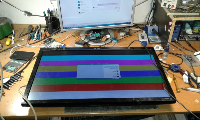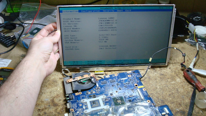 Раскидал крышку матрицы, шлейфов дешифраторов два, а картинка делится четко пополам, ага, скорее всего проблема в матрице. Самый простой способ в этом убедится тестер матриц или подкинуть на другой ноут. Что мы и делаем. На фото плата леново G460 полностью исправна. А картинка такая же. Матрица приговорена к замене, заказана ждем.