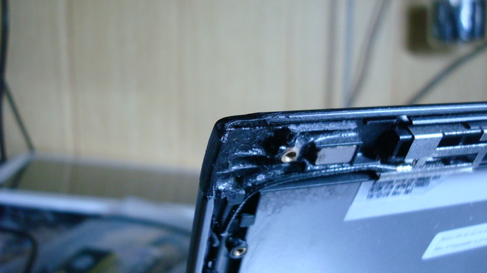 Ремонт - проблемы с подключением матрицы, сама матрица ОК. После ремонта ноутбук проработал год, сейчас работает только с внешним монитором (иногода включается и экран ноута, половина в плохом качестве, см. фото).Также отбит уголок (см. фото). Аккумулятор снят, т.к. вздулся."