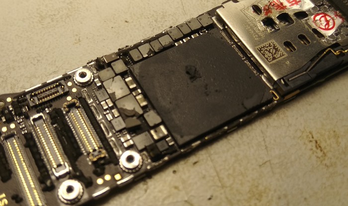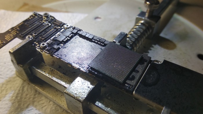 Реболлим процессор, ставим. И получаем не включающийся и совсем никак не определяющийся телефон. Немного не повезло и проц отъехал – последствия удара, наверняка образовался внутри дефект, а под воздействием температуры при демонтаже это усугубилось.