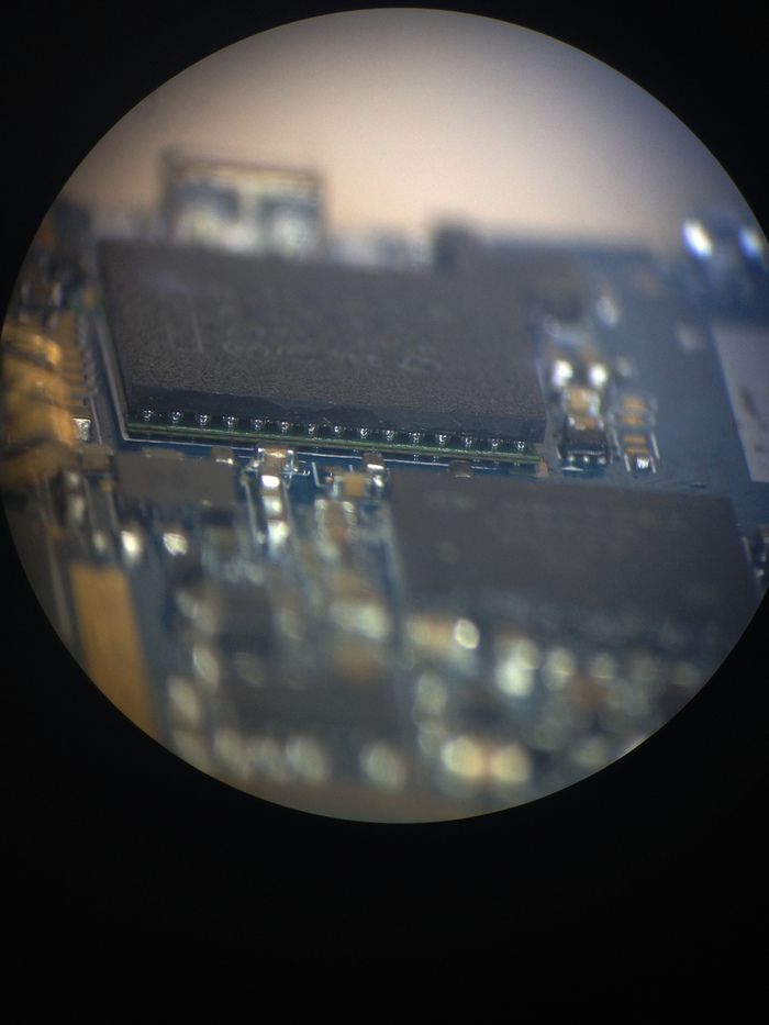 Первым делом аппарат был зашит последней прошивкой, результата это не дало. После я снял железяку с серийниками, которая закрывала микросхемы и включил телефон, слегка надавливая на проц, тел заорал как ненормальный. К гадалке ходить не надо, будем катать.