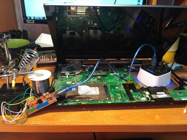 Подаю питание, автостарт, инициализация, картинка на матрицу. Ну убили двух зайцев, и матрицу проверили и ноут включается.