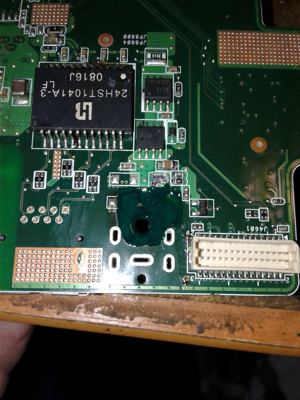 Снимаем, и видим что 2 пятачка просто выгорели(обведены красным), чистим все от компаунда, лудим