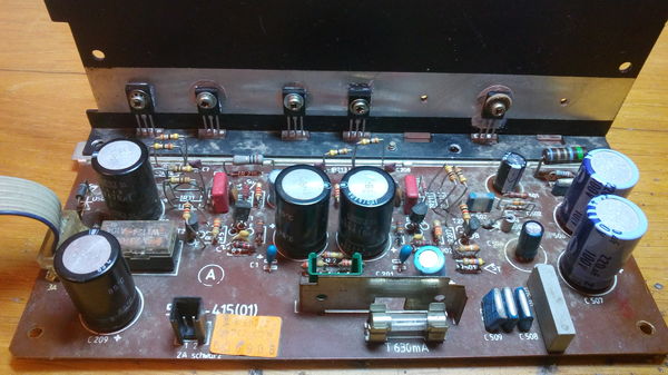 Меняем электролиты, подгоревшие резисторы, неисправные транзистор bd829 и диод 1N4147. Снимаем плату с выходным каскадом, выпаиваем все транзисторы и проверяем их, также не забываем проверить остальные пассивные элементы. Выяснилось, что часть выходных транзисторов приказала долго жить. Так как они давно не выпускаются, а пара транзисторов G745/746 на ибэй стоят 1300 руб, то используем замену их на подобранные КТ8101/8102 (неоднократно испытанную уже). Те G745/746, что были сняты, пойдут на воскрешение аналогичного бедолаги. Меняем электролиты в блоке питания. Сверлим отверстия под выводы конденсаторов.