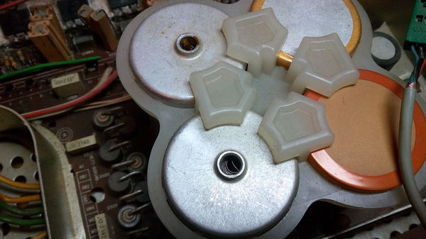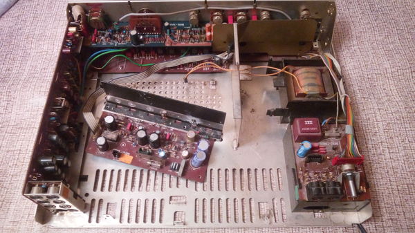 Обкусывают ножки у старых конденсаторов и на них напаиваются новые. Делаем первое включение предварительного усилителя. Начинают издаваться какие-то звуки - и это хорошо. Пошуршивают регуляторы, поскрипывают переключатели выхода и отсутствует регулировка тембра 2500 Hz одного из каналов. С аналогичной неисправностью регулятора тембра я уже сталкивался и мои догадки оправдались - ушла в обрыв катушка индуктивности. Разбираем пепелац: