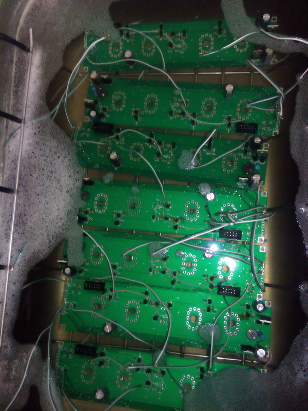 В процессе пришло несколько дополнительных идей, например захотелось добавить автоматическую регулировку яркости и несколько изменить то, как будет отображаться включенный будильник. Удалось решить с помощью нескольких проводков, допаянных на плату. Решено, что на этой версии платы можно сделать часы, за которые не будет стыдно. Допаяли еще несколько плат, кстати флюс удобно отмывать в ультразвуковой ванне: