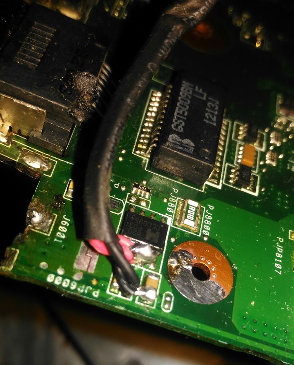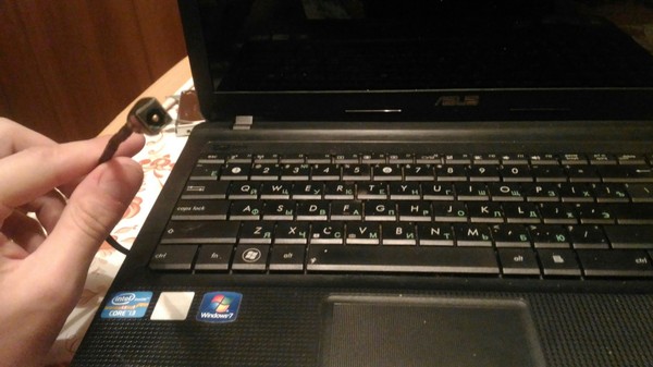 Частая болезнь Асусов при выламывании петель - ломается посадочное место коннектора питания и он начинает выпадать вовнутрь, болтаться. Иногда встречается с оторванными проводами. Проверяем надежность.