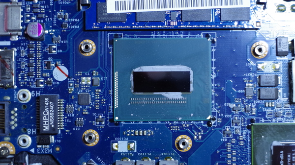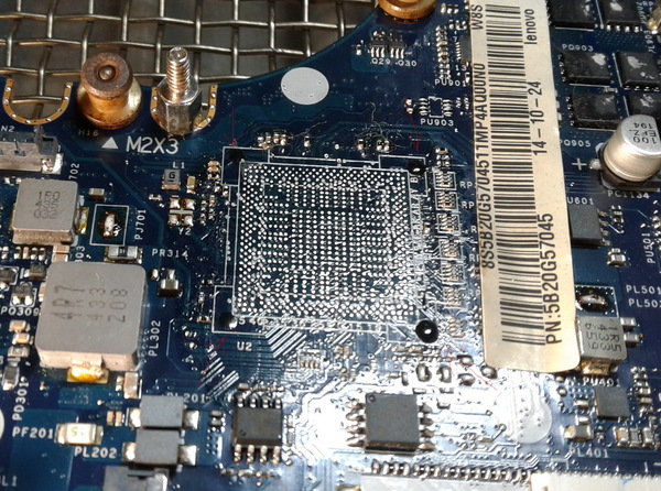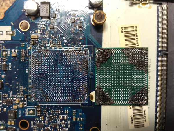 Заказываем новый, снимаем старый. Стрелочками отмечен мерзопакостный ленововский компауд, используют они сие говно со времен Thikpad линейки. Нужно сильно перегревать плату, что бы это говно разрушилось и можно было сдернуть чип. Но тут повезло, робот промазал, только один угол держал и то слабенько.