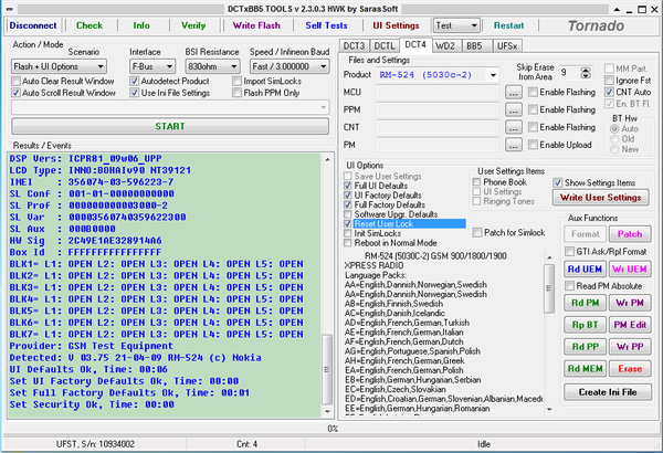 Теперь запускаем программу DCTxBB5, коннектимся к боксу. На вкладке DCT4 находим наш девайс. Данные нам не нужны, затерём аппарат полностью. Ставим галочки на Full UI Defaults, UI Factory Defaults, Full Factory Defaults и Reset User Lock. Жмякаем в верху на UI Settings.