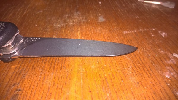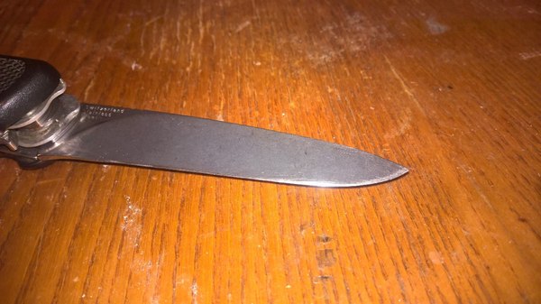 Швейцарский нож "Wenger" при использовании которого не задействовали его многофункциональность, ибо вскрывали консервы клинком, не смотря на наличие специальной открывашки для консервов. Да и судя по тому что клинок превратился в "нож для масла", консервы были минимум бетонные.