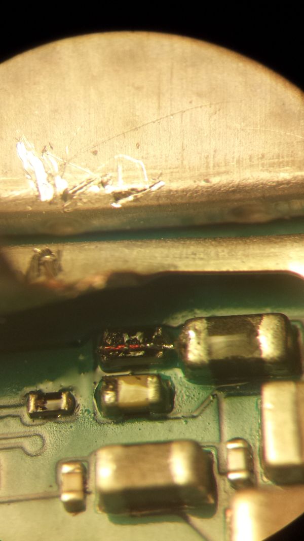 В районе разъемов, где высокие напряжения, для телефона естественно, высокие. Там порядка 30-38 вольт. В разъеме, где высокие, от воды, в процессе электролиза, разъело контактики...