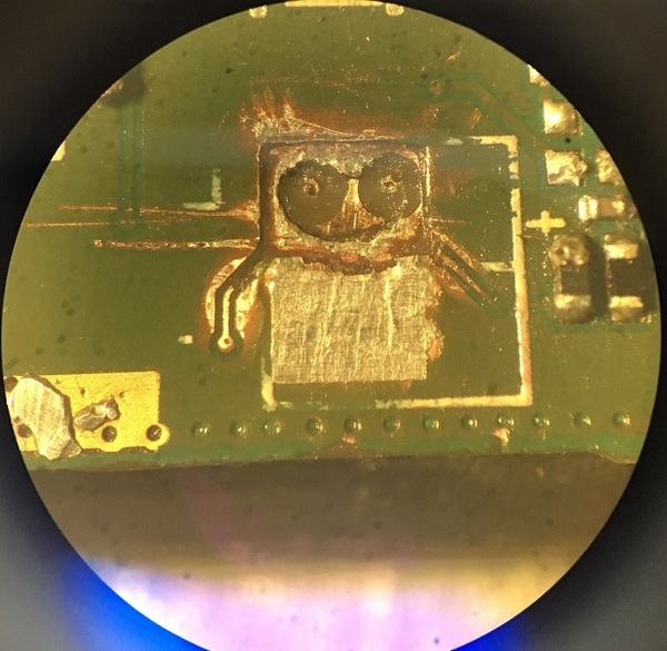 1) Дорожка по верхнему слою проходила через оставленный пятачок для того, чтобы микросхема отдавала туда тепло
