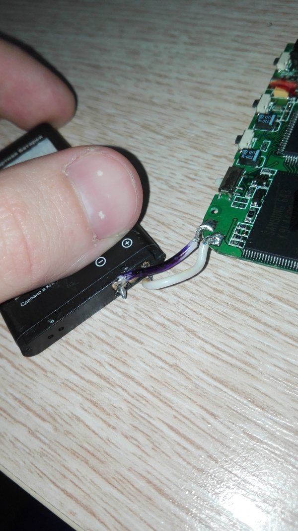Всё просто плюс к плюсы, минус к минусу. Чтобы припаялось слегка подцарапал контакты на батарее.