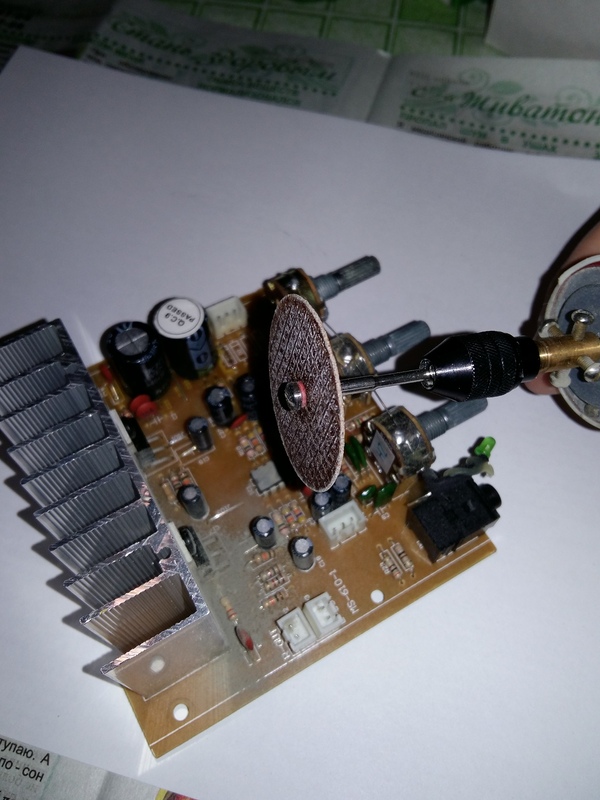 Из своего барахла я не нашёл ИМС - сдвоенного ОУ в корпусе DIP-8, и дело было в выходной день, на работу не попасть, где можно было бы что-то покопаться в барахле и нарыть, и магазины тоже закрыты. Но в моём барахле было несколько разных ИМС ОУ в корпусе SO-8 с такой же цоколёвкой как и в DIP-8, я выбрал AD706AR. Но надо было её установить по месту DIP, для чего пришлось бы изготовить платку-адаптер SO to DIP, но было лень рисовать и травить, а в домашней лаборатории таких не держал (надо будет заказать с Али, на всякий случай). На проволоках лепить SO-8 тоже не хотелось, потому как в колонке присутствуют вибрации и на весу микросхему держать не очень хорошо, или проволочки оторвутся, или выводы у микросхемы. Тогда решил попробовать снять верхний слой компаунда у стоявшего ОУ 4558 DIP, добраться до выводов и кристалла, чтобы посмотреть можно ли на эти выводы установить микросхему SO-8. "Крышу" снял с помощью отрезного диска и микродрели, в общем микро-болгаркой ) Ниже на снимках видно ОУ DIP-8, правда я уже немного начал снимать верхний слой, а потом решил запилить пост здесь на Pikabu в сообщество ремонтёров, вдруг кому пригодится.