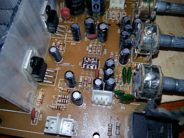 После этого начал анализировать схему и искать - откуда идёт шум. Начал с микросхемы УМЗЧ, на её входе стоял электролитический конденсатор, идущиё от предварительного усилителя, я его выпаял - шум пропал, значит он не от самого УМЗЧ, а берётся раньше. Проверил конденсатор, оказался исправным.