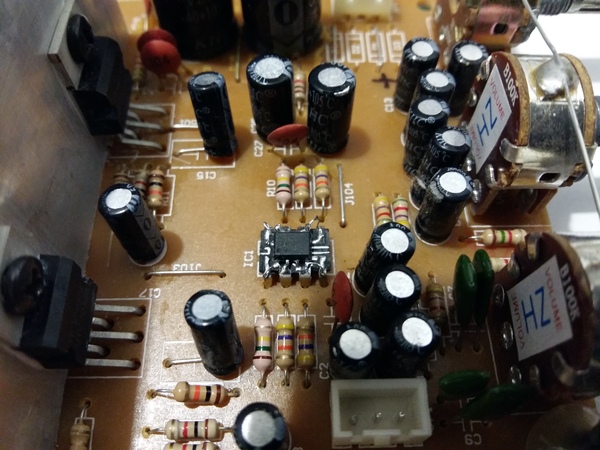 Затем я нашёл в шуршащем канале ОУ вход, на который сигнал от узла тембра поступал также через электролитический конденсатор. Этот конденсатор также демонтировал и после этого шум не пропал, что сразу указывает на то, что шум берётся из предварительного усилителя, у которого нет никаких цепей компенсации, он работает чисто усилителем, а значит шум берётся в нём самом. Это, конечно немного странно, т.к. ранее этого шума не было, и микросхема если выходит из строя, то чаще всего она совсем не работает, а здесь вроде работает, но вносит шум в полезный сигнал.