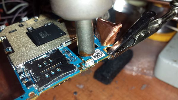 С помощью медной фольги или какой-нибудь другой фольги, защитим, в нашем случае, датчик приближения. На фоточке справа, рядом с кусакой.