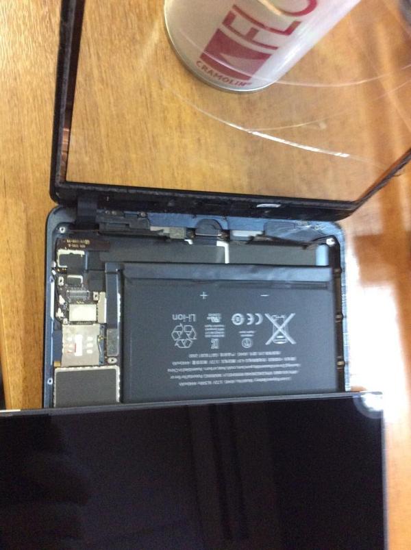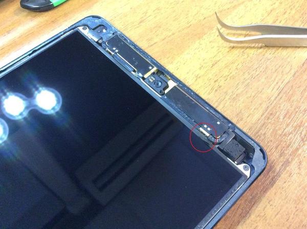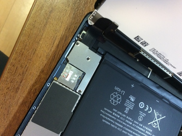 Под экраном находится пластина, которая крепится на винты. Нужно по кругу открутить 16 винтов, после чего, пластину можно снять. Под ней находится вся «начинка» iPad mini.