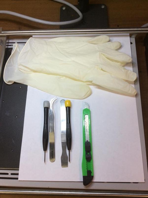 Из инструмента я использую, отвертку крестовую и тоненькую плоскую. Пинцет, лапатку, и обычный канцелярский ножик (да-да вы не ослышались). Так же медицинские перчатки