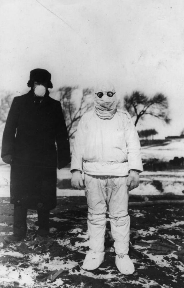Врач в защитной одежде во время вспышки чумы в Маньчжурии, около 1912 года.