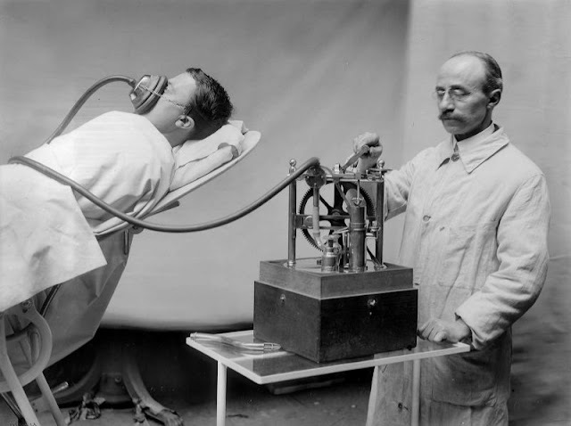 Лейтенант Радтке нагнетает воздух в легкие, пока врач проверяет его кровяное давление, около 1932 года.