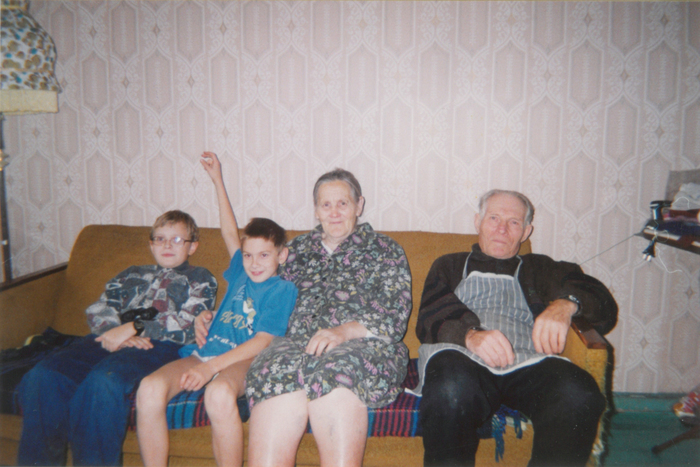 Мы с Тимохой и его Дедушка и Бабушка - Георгий Феофанович и Анна Ивановна. Дедушка научил нас работать руками. Но Тимоха работает руками сильно лучше меня. 96 год.