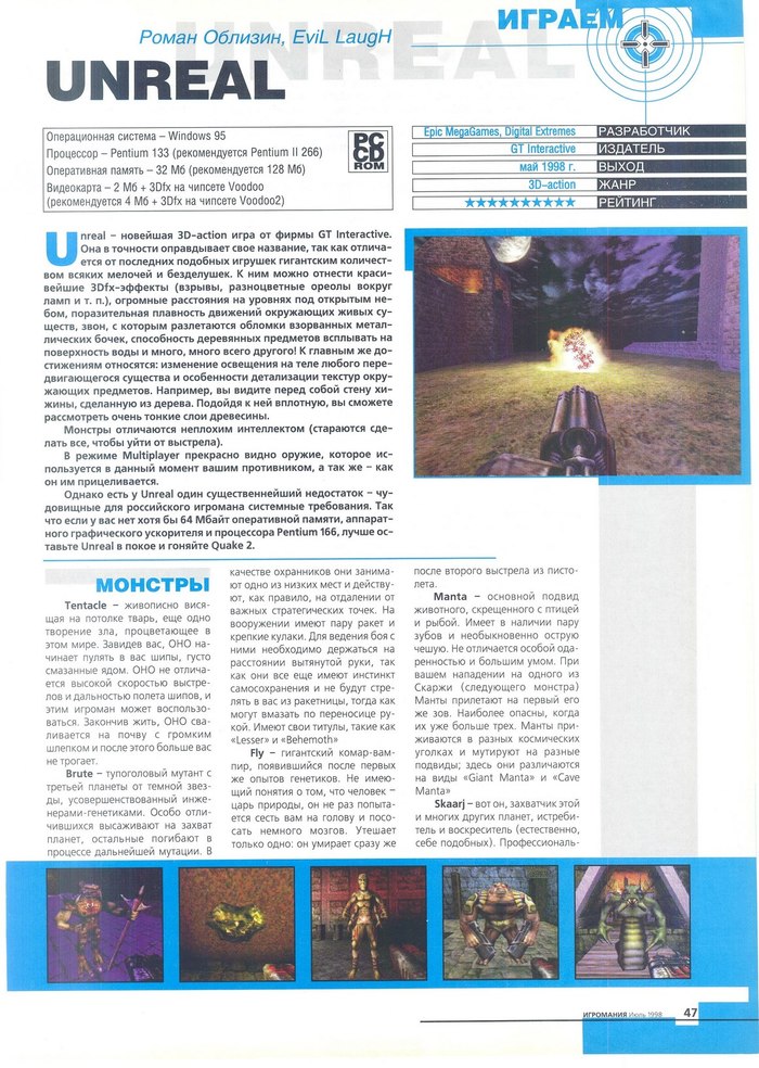 "Unreal - красивейшие 3Dfx-эффекты (взрывы, разноцветные ореолы вокруг ламп и т.п.), огромные расстояния на уровнях под открытым небом, поразительная плавность движений окружающих живых существ, звон, с которым разлетаются обломки взорванных металлических бочек, способность деревянных предметов всплывать на поверхность воды и много, много всего другого!"