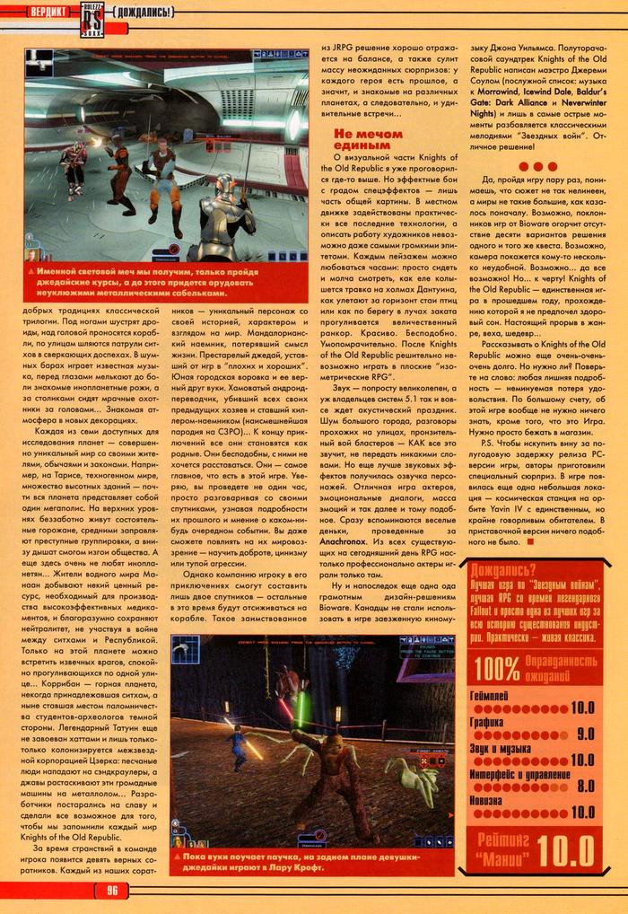 "SW - Knights of the Old Republic — не просто хорошая игра. Это настоящая Игра. Игра, которую еще долго будут обсуждать и проходить по два, три, четыре и десять раз. Игра, которая просто обречена на продолжение. Игра, не купив которую, вы, возможно, рискуете пропустить самое увлекательное виртуальное приключение последних лет."