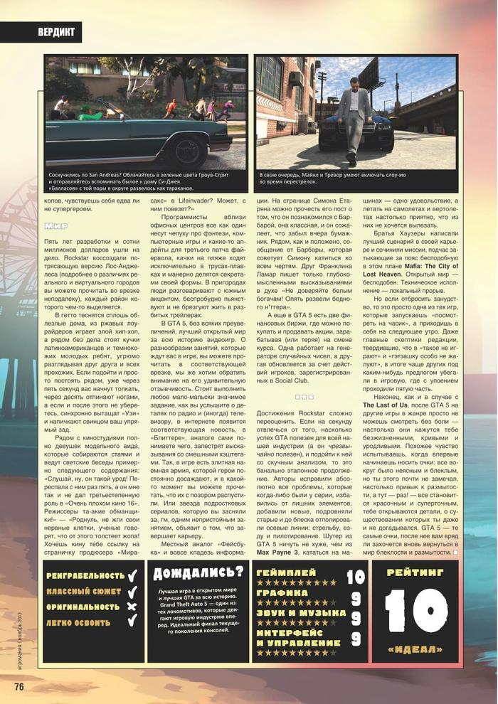 А завершит эту подборку то, что живее всех живых и сейчас. GTA5. "Достижения Rockstar сложно переоценить. Если на секунду отвлечься от того, насколько успех GTA полезен для всей нашей индустрии (а он чрезвычайно полезен), и подойти к ней со скучным анализом, то это банально эталонное продолжение."