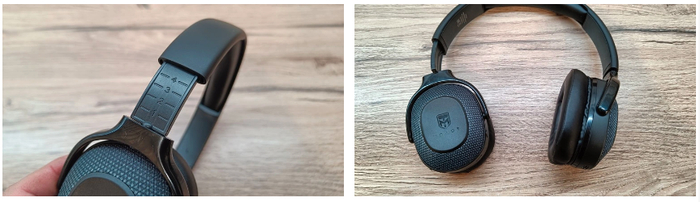 Дужка оголовья выполнена из матового пластика и на ней совсем не видно следов отпечатка пальцев, да и эксплуатации в целом. Внутри дужки размещается вставка из мягкого материала аналогичного амбушюрам. Оголовье в меру жесткое и удобно усаживается на голове. Лично мне наушники не давят и после нескольких часов я вовсе забыл, что они у меня.