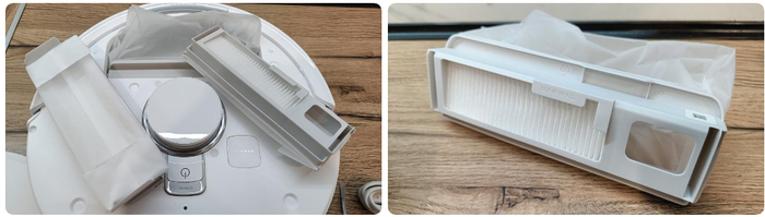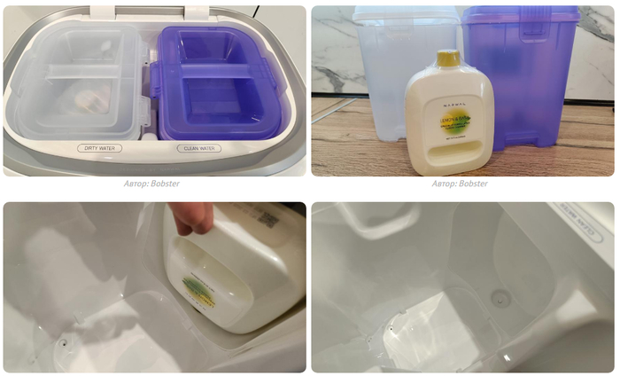 Под крышкой размещаются 2 бака для чистой и грязной воды. Комплектное моющее средство имеет приятный лимонный аромат. Само моющее средство заливать в бак с чистой водой не придется, так как бутылку потребуется лишь установить внутри контейнера. Пылесос будет автоматически добавлять моющее средство в воду при необходимости или интенсивности загрязнения. Режим добавления можно настроить в мобильном приложении. Оба контейнера для воды извлекаются из станции.